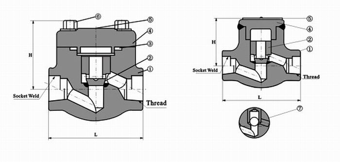 The forged steel piston check valves are manufactured according to API, ANSI, ASME standard, for industrial applications. The forged check valves can be piston type, ball type, swing check type. The cover is bolted; NPT threaded or socked welded ends. The body of the valve is in A105/F6, other materials are available upon request.